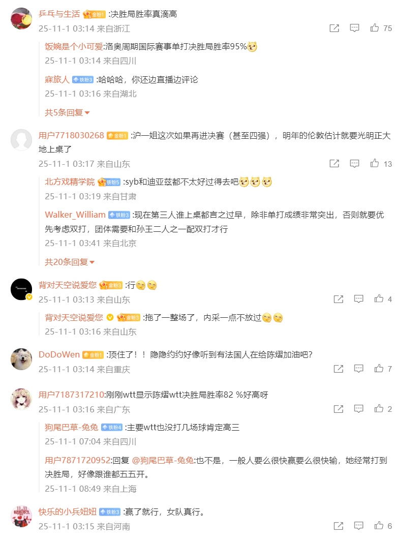 球迷们已经高呼,陈熠是决胜局女王了,调侃她洛奥周期决胜局的胜率超过95%,实际上WTT官方陈熠决胜局的胜率为82%,但这个胜率也已经非常不错了,决胜局女王的称号当之无愧。