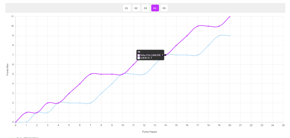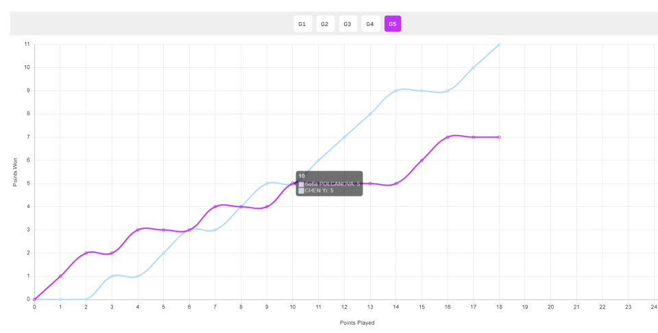 决胜局开场波尔卡诺娃是3-1领先,陈熠追到3-3、4-4、5-5,紧接着陈熠的攻势变得非常凌厉一波4-0拉开差距,波尔卡诺娃追到7-9后陈熠一波流带走比赛。